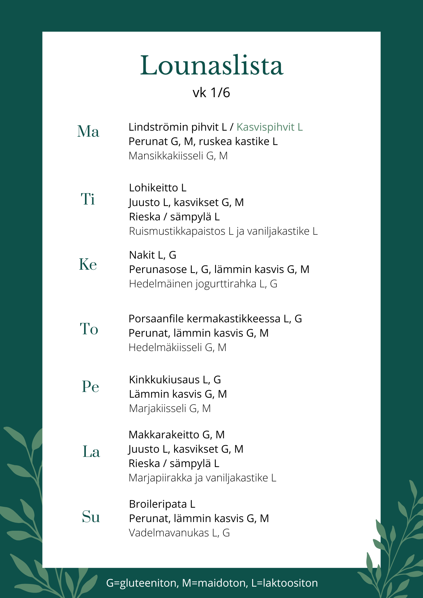 Huom! Tammikuusta 2025 alkaen viikonloppulounas ei ole katettuna linjastolle, mutta valmiin annoksen voi edelleen noutaa mukaan keittiön ovelta klo 11-12.